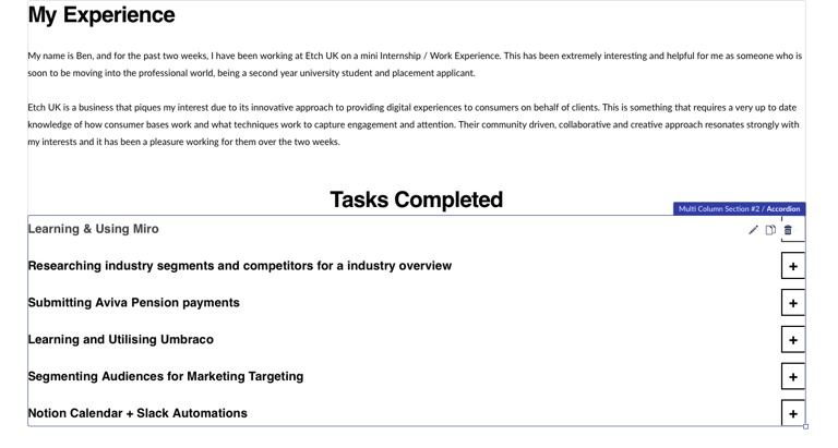 Some tools that I have learnt how to use during my time at Etch include Slack, Umbraco and Miro, alongside progressing my competency with the Microsoft suite including Excel to sort and manage data and PowerPoint to deliver deck style information. These competencies will definitely give me a head start in the world of work that I am soon to be a part of!