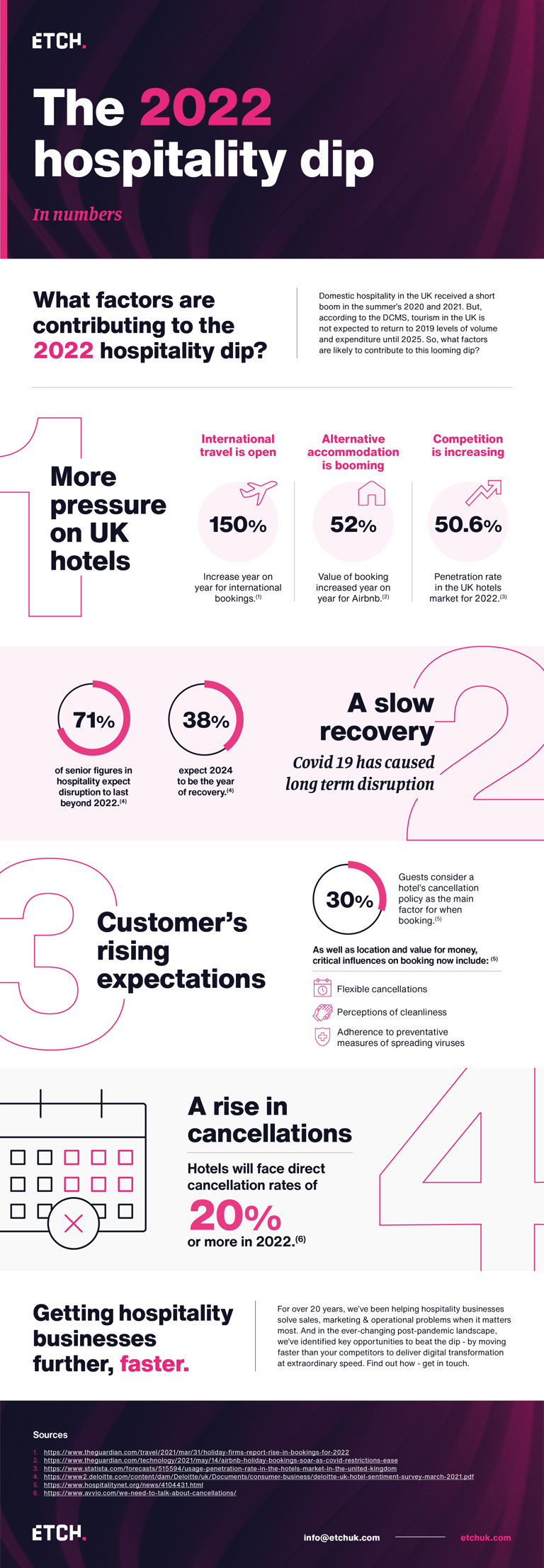 Domestic hospitality in the UK received a short boom in the summer’s 2020 and 2021. But, according to the DCMS, tourism in the UK is not expected to return to 2019 levels of volume and expenditure until 2025. So, what factors are likely to contribute to this looming dip? We take a look at the numbers.