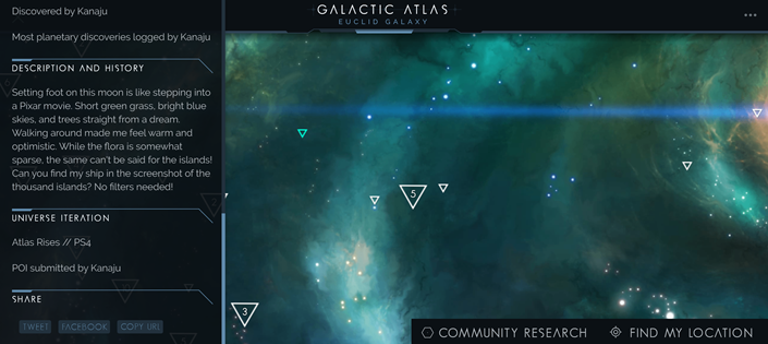 What manifested from these discussions was the Galactic Atlas: A companion web application that was populated by the players, a place to share their fondest memories, most impressive screenshots and whereabouts in the universe they liked to hang out. The resulting archive lists hundreds of player submitted points of interest, alongside summary information about organically emerging player community hubs.