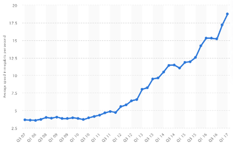 Take a look at this graph, which charts average internet speed of home internet in the United States. I’ve chosen the US here because as well as being an enormous market, the US is fairly average, as internet speeds go. They have some good speeds, and some places with very poor speeds. Overall, not great, not terrible. Think of them as the lowest common denominator – many countries have better internet than this (Not Australia though. Sorry Australia.)